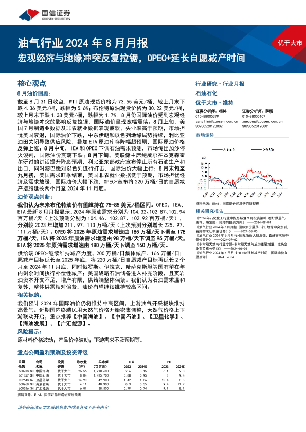 【国信证券】【20240909】油气行业2024年8月月报:宏观经济与地缘冲突反复拉锯,OPEC+延长自愿减产时间-25页