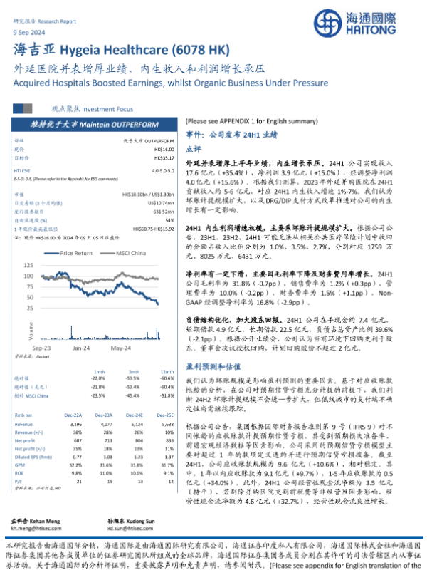 【海通国际】【20240909】海吉亚医疗(6078.HK)外延医院并表增厚业绩,内生收入和利润增长承压-15页