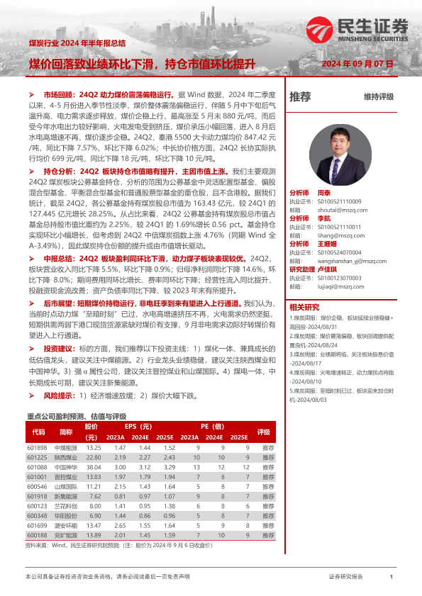 【民生证券】【20240907】煤炭行业2024年半年报总结:煤价回落致业绩环比下滑,持仓市值环比提升-16页