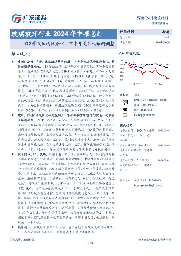 【广发证券】【20240908】玻璃玻纤行业2024年中报总结:Q2景气结构性分化,下半年关注供给端调整-28页