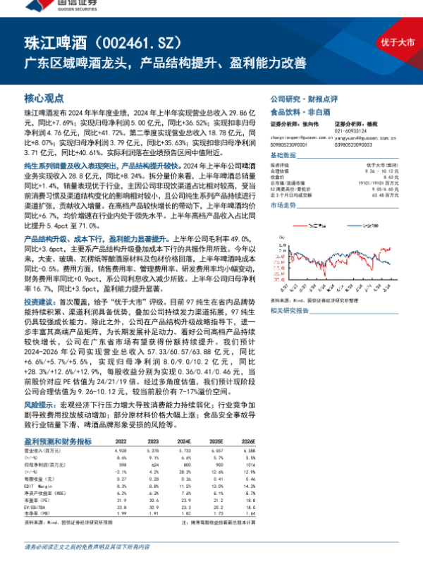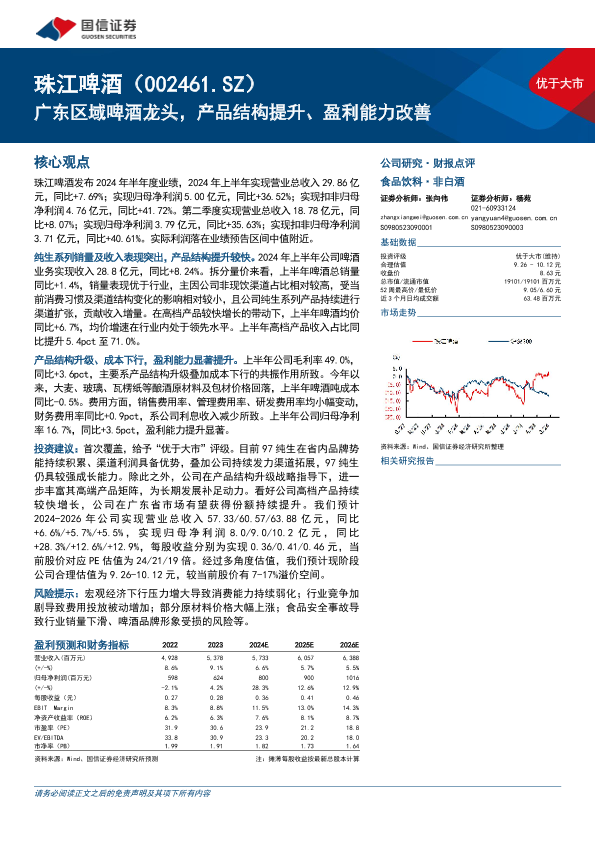 【国信证券】【20240909】珠江啤酒(002461)广东区域啤酒龙头,产品结构提升、盈利能力改善-21页