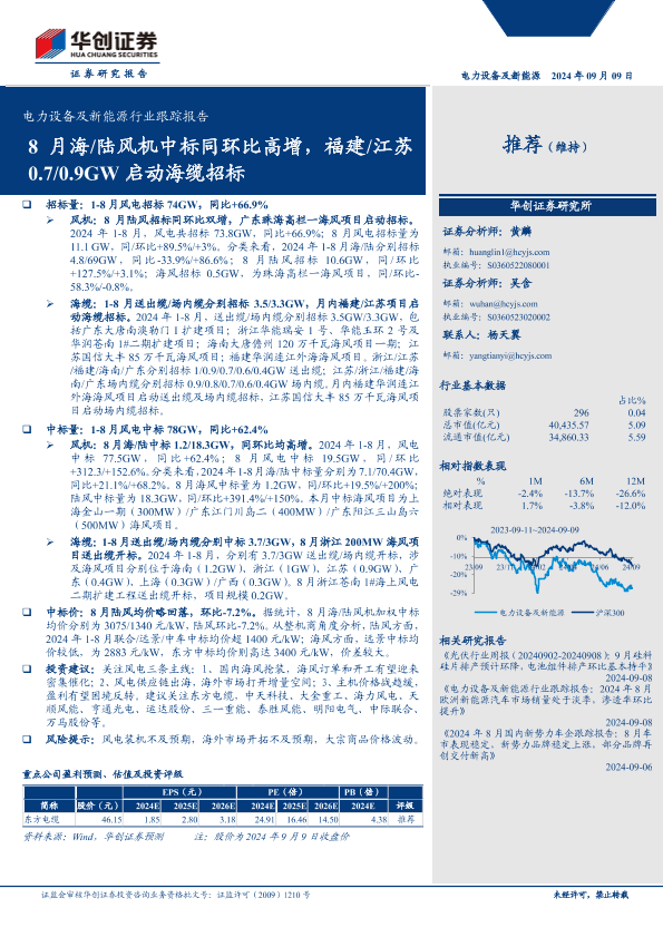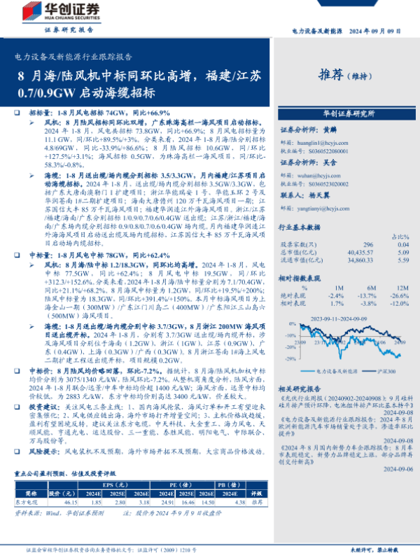 【华创证券】【20240909】电力设备及新能源行业跟踪报告:8月海/陆风机中标同环比高增,福建/江苏0.7/0.9GW启动海缆招标-11页