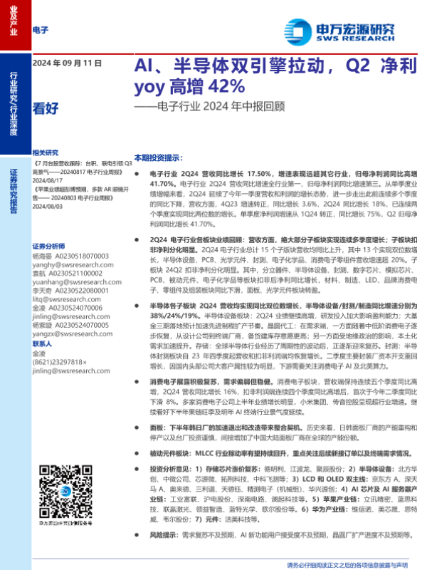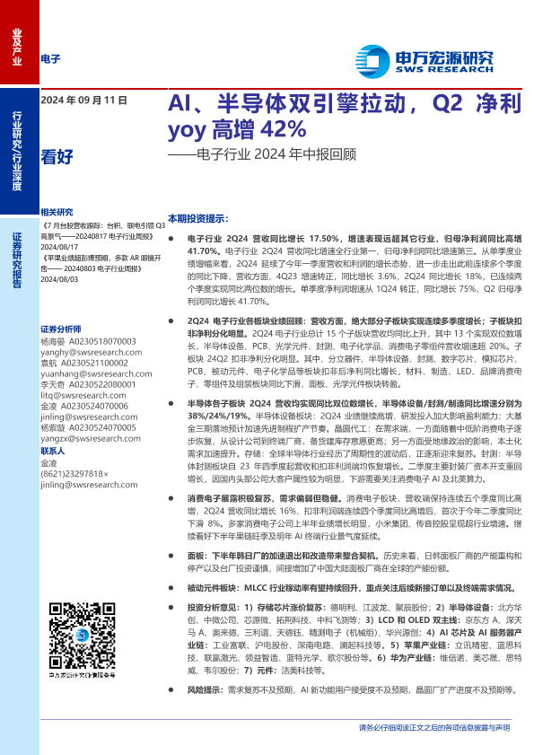 【申万宏源】【20240911】电子行业2024年中报回顾:AI、半导体双引擎拉动,Q2净利yoy高增42%-21页