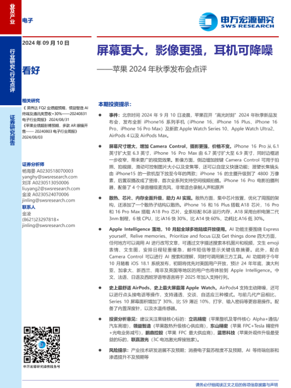 【申万宏源】【20240910】电子行业苹果2024年秋季发布会点评:屏幕更大,影像更强,耳机可降噪-13页