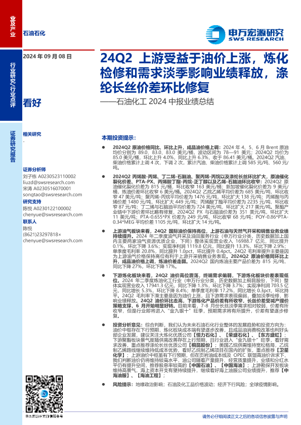 【申万宏源】【20240908】石油化工行业2024中报业绩总结:24Q2上游受益于油价上涨,炼化检修和需求淡季影响业绩释放,涤纶长丝价差环比修复-14页