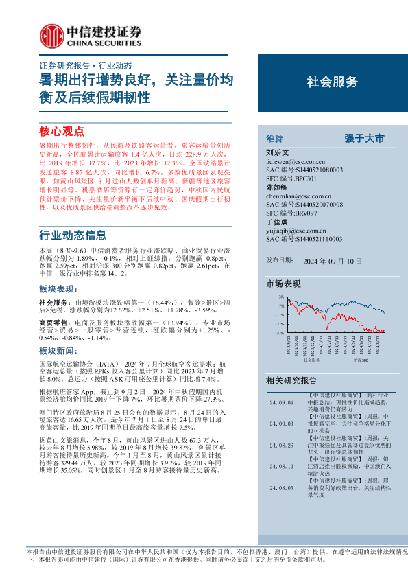【中信建投证券】【20240910】社会服务行业:暑期出行增势良好,关注量价均衡及后续假期韧性-26页