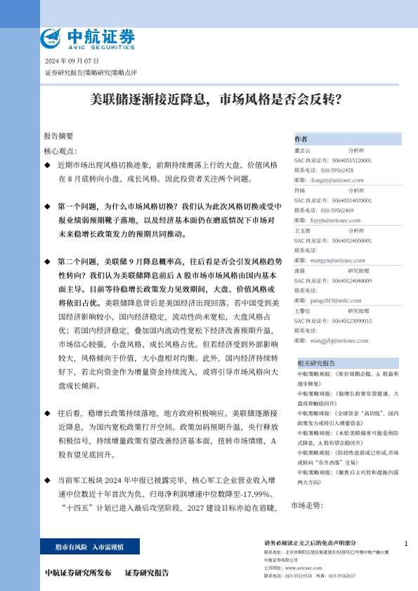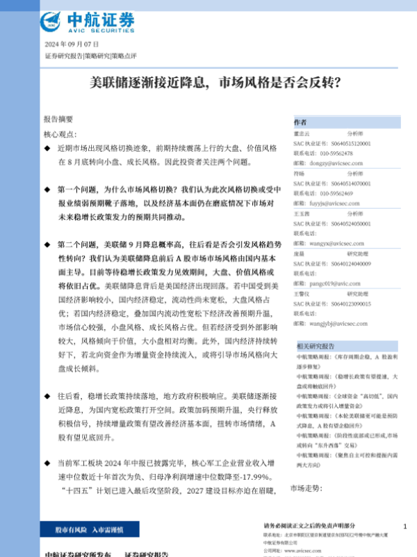 军工行业 市场风格切换 稳增长政策 经济基本面 美联储降息