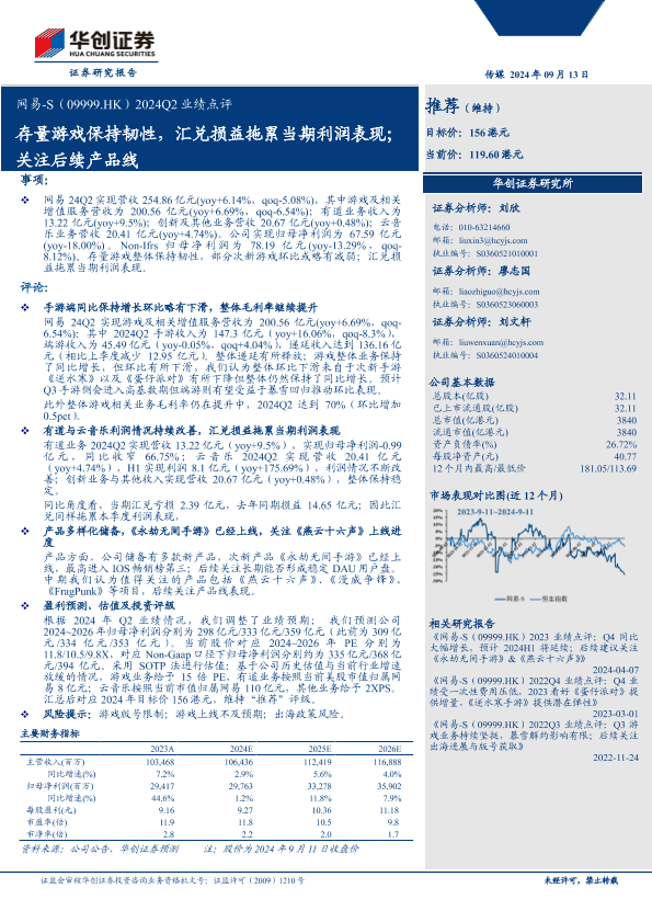 【华创证券】【20240913】网易-S(09999.HK)2024Q2业绩点评:存量游戏保持韧性,汇兑损益拖累当期利润表现;关注后续产品线-13页