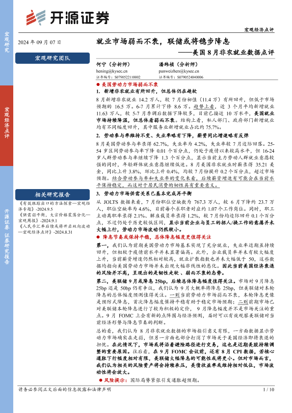 【开源证券】【20240907】美国8月非农就业数据点评:就业市场弱而不衰,联储或将稳步降息-10页