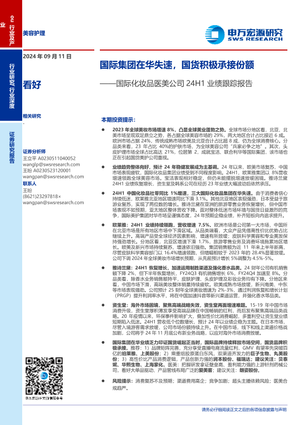 【申万宏源】【20240911】美容护理行业国际化妆品医美公司24H1业绩跟踪报告:国际集团在华失速,国货积极承接份额-27页