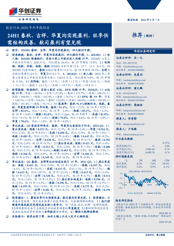 【华创证券】【20240907】航空行业2024年半年报综述:24H1春秋、吉祥、华夏均实现盈利,旺季供需结构改善,航司盈利有望兑现-19页