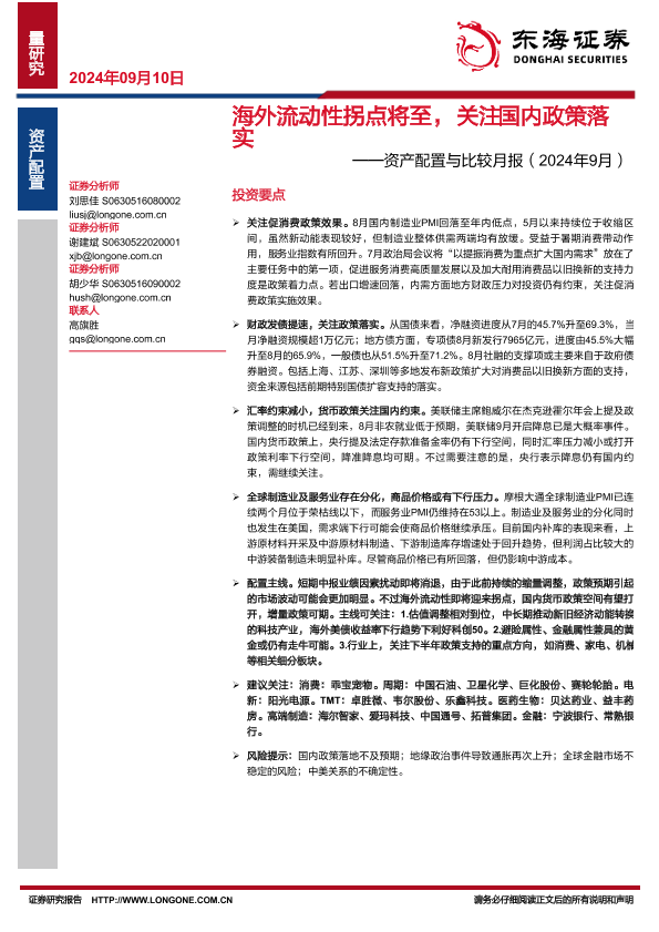 【东海证券】【20240910】资产配置与比较月报(2024年9月):海外流动性拐点将至,关注国内政策落实-22页