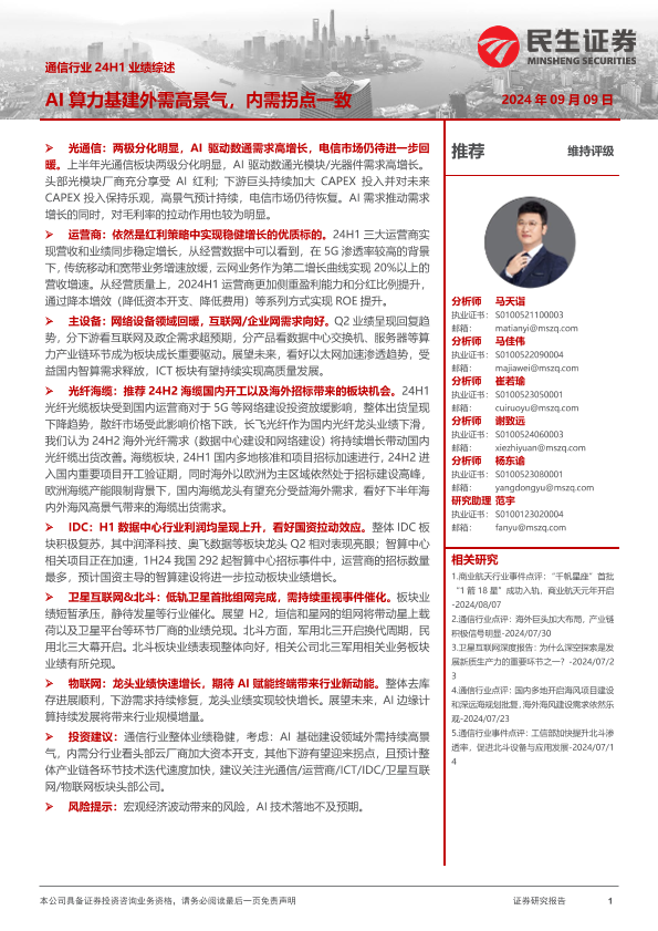 【民生证券】【20240909】通信行业24H1板块综述:AI算力基建外需高景气,内需拐点一致-23页