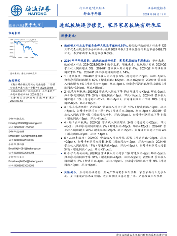 【海通证券】【20240911】造纸轻工行业半年报:造纸板块逐步修复,家具家居板块有所承压-10页