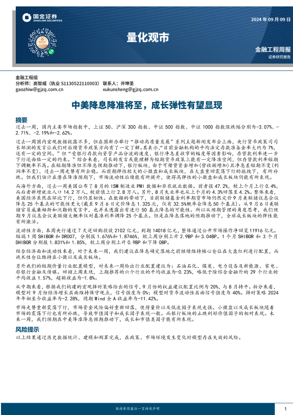 【国金证券】【20240909】量化观市:中美降息降准将至,成长弹性有望显现-13页