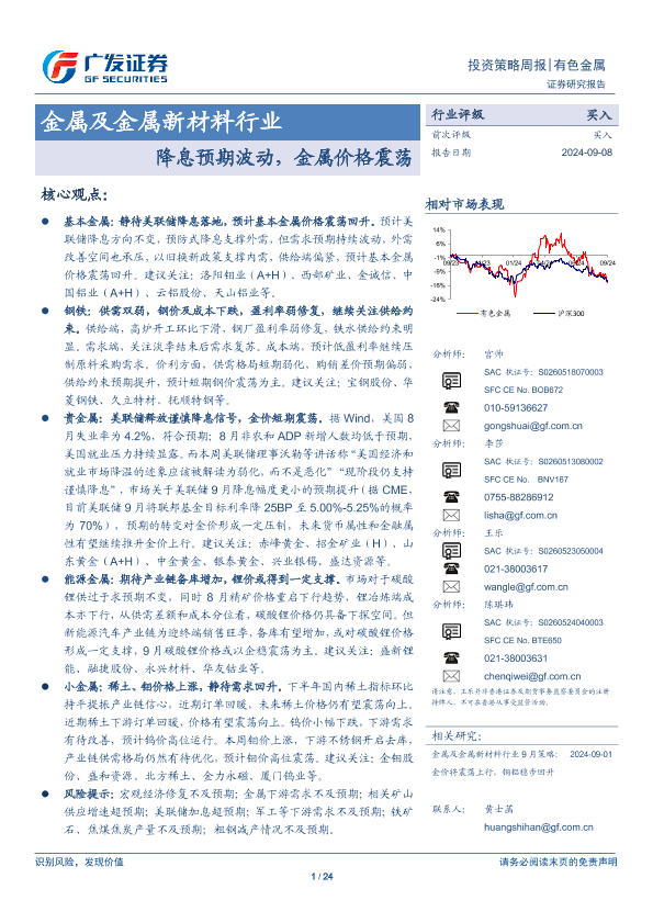 【广发证券】【20240908】金属及金属新材料行业:降息预期波动,金属价格震荡-24页