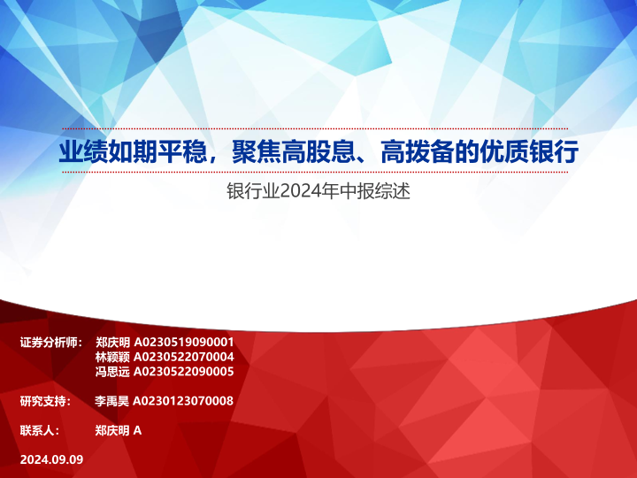 【申万宏源】【20240909】银行业2024年中报综述:业绩如期平稳,聚焦高股息、高拨备的优质银行-49页