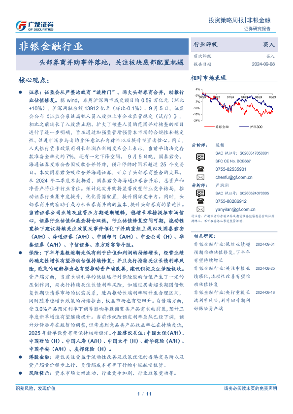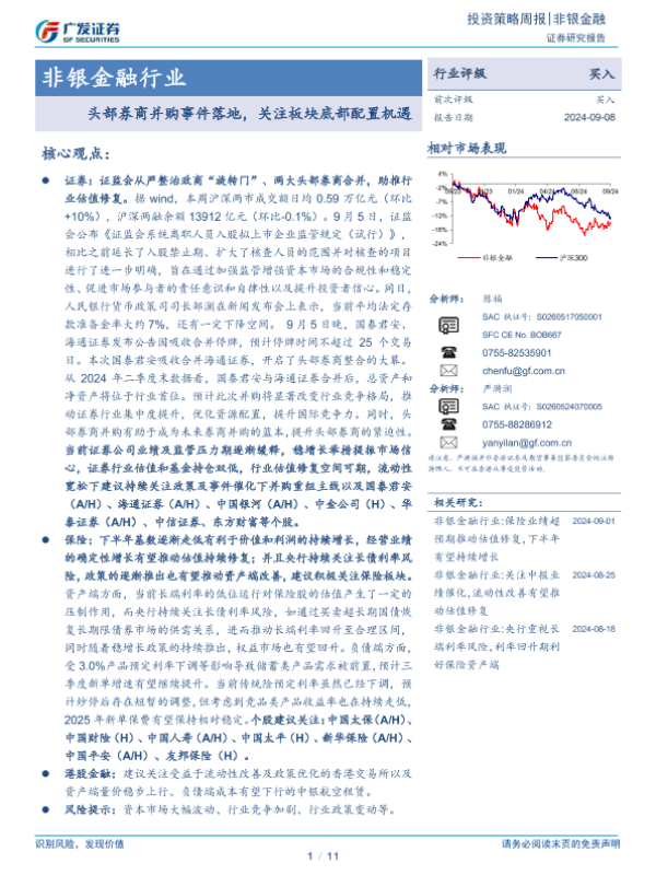 【广发证券】【20240908】非银金融行业:头部券商并购事件落地,关注板块底部配置机遇-11页