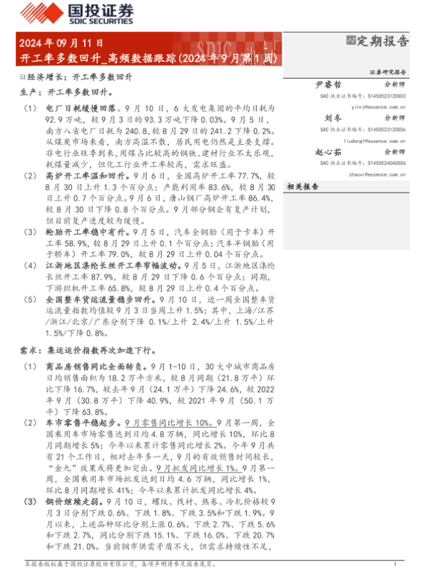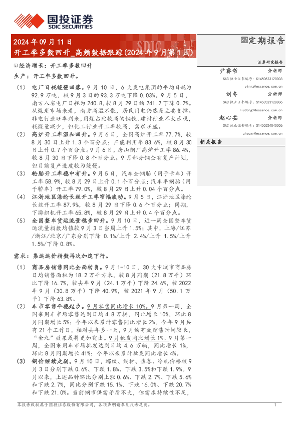 【国投证券】【20240911】高频数据跟踪(2024年9月第1周):开工率多数回升-15页