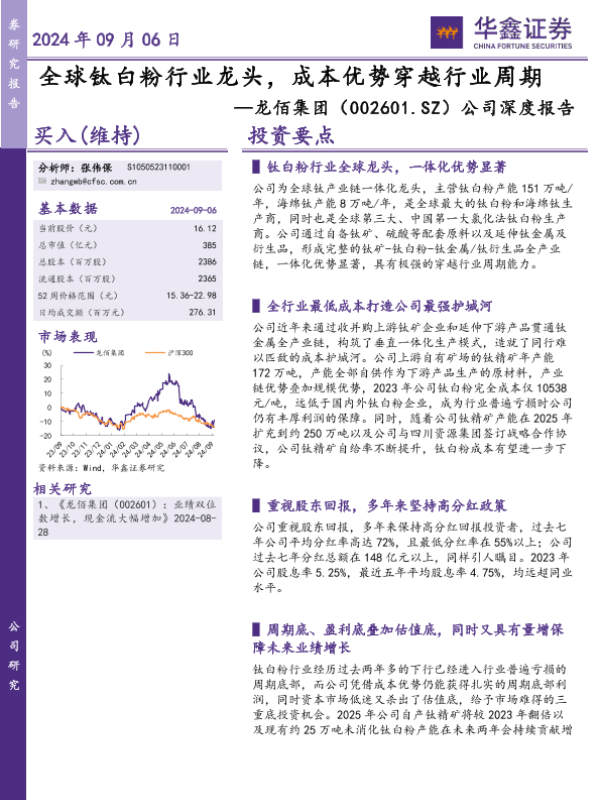 【华鑫证券】【20240906】龙佰集团(002601)公司深度报告:全球钛白粉行业龙头,成本优势穿越行业周期-48页