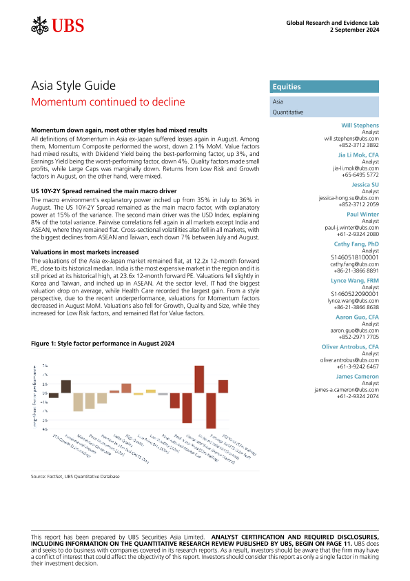 【UBS Securities Asia Limited】【20240902】UBS Equities-Asia Style Guide Momentum continued to decline-15页