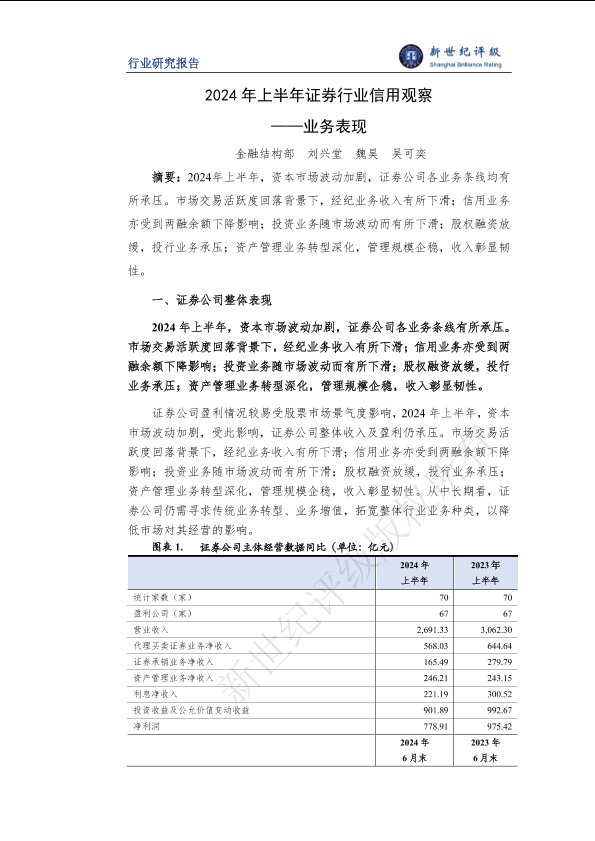 2024年上半年 业务表现 信用观察 证券行业 资本市场