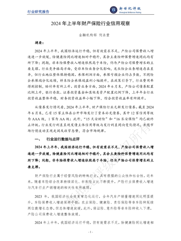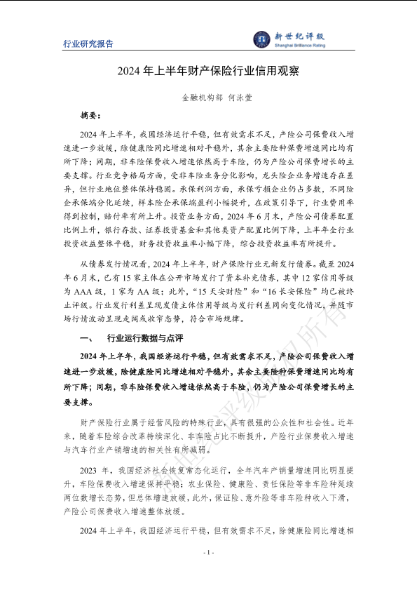 【金融机构部何泳萱】【20240630】2024年上半年财产保险行业信用观察-14页
