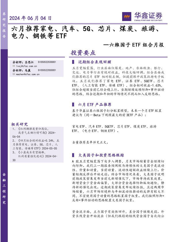 【华鑫证券】【20240604】六维因子ETF组合月报:六月推荐家电、汽车、5G、芯片、煤炭、旅游、电力、钢铁等ETF-17页