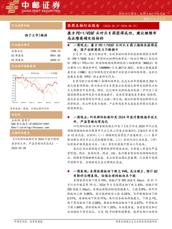 【中邮证券】【20240602】医药生物行业报告:康方PD-1/VEGF头对头K药获得成功,建议继续布局业绩高确定性标的-17页