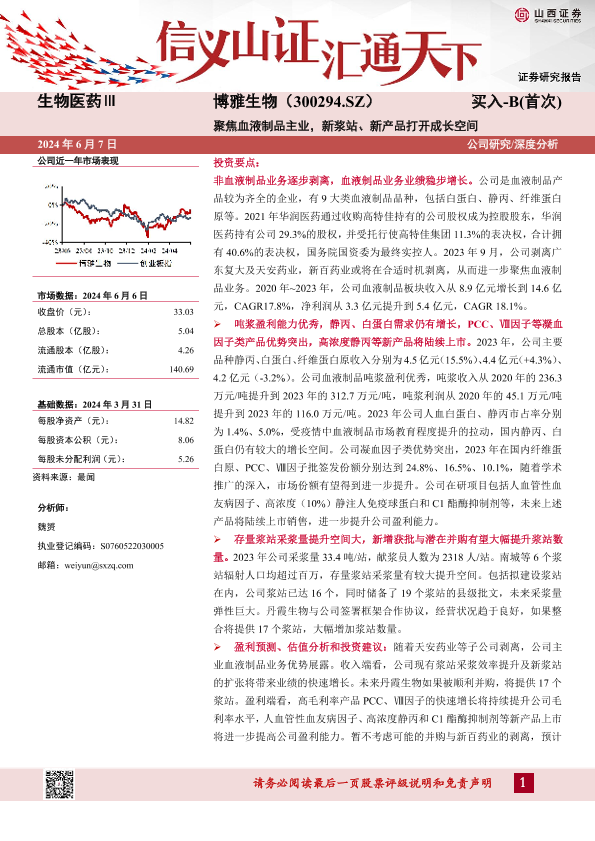 【山西证券】【20240607】博雅生物(300294)聚焦血液制品主业,新浆站、新产品打开成长空间-31页