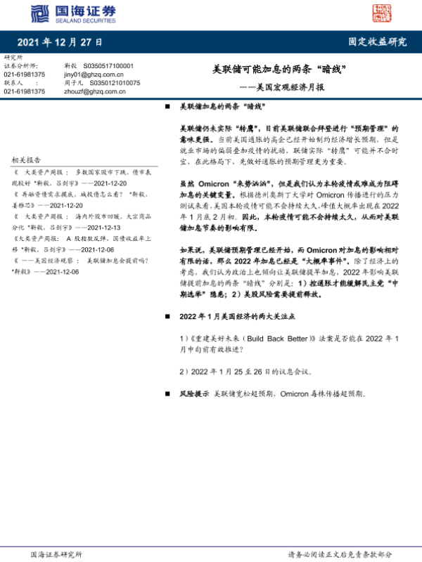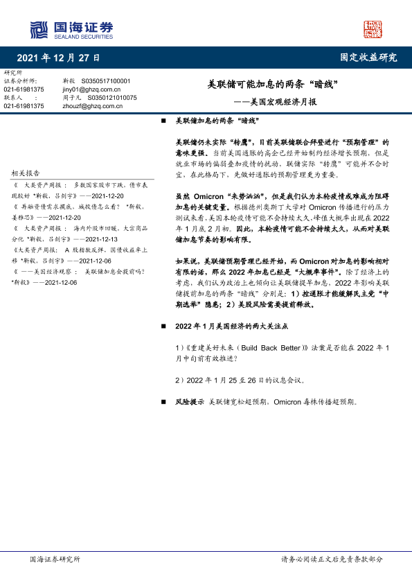 【国海证券】【20211227】美国宏观经济月报:美联储可能加息的两条“暗线”-19页