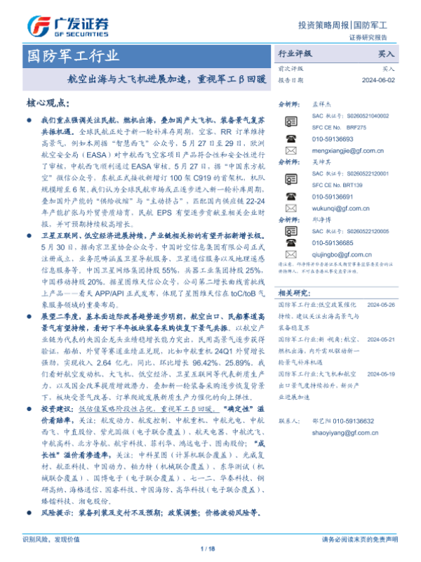 【广发证券】【20240602】国防军工行业:航空出海与大飞机进展加速,重视军工β回暖-18页