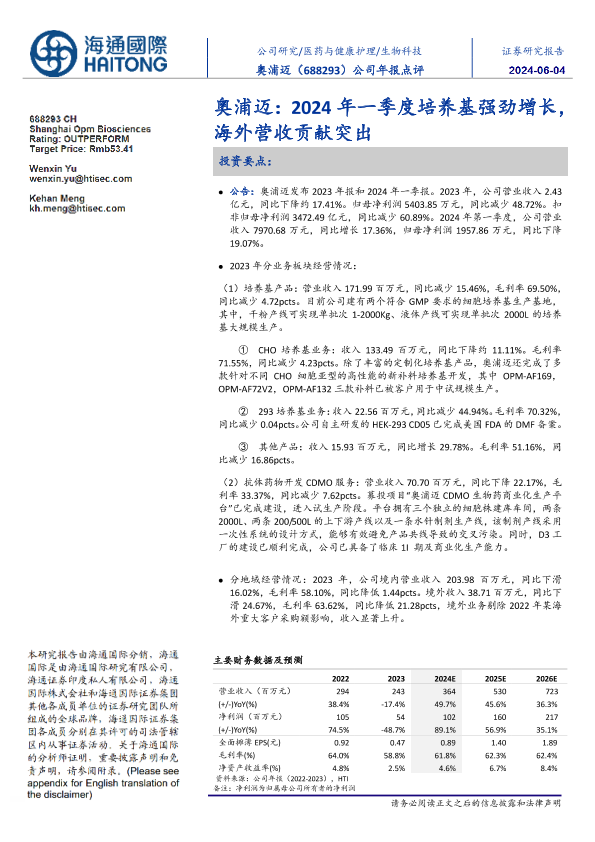 【海通国际】【20240601】奥浦迈:2024年一季度培养基强劲增长,海外营收贡献突出-13页
