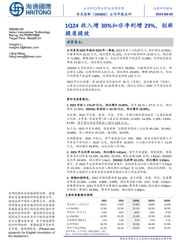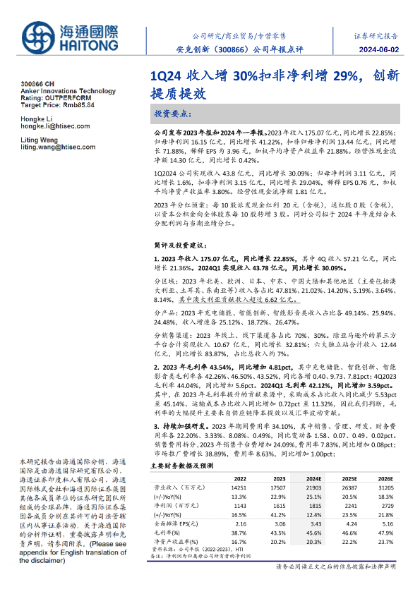 【海通国际】【20240601】安克创新-300866.SZ-公司年报点评:1Q24收入增30%扣非净利增29%,创新提质提效-13页