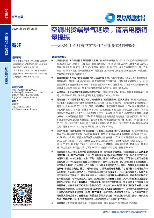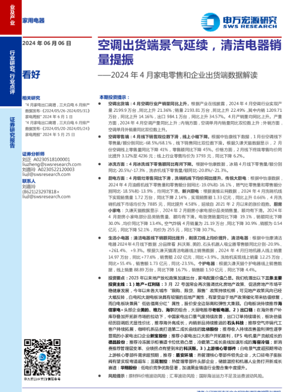 【申万宏源】【20240606】家用电器行业2024年4月家电零售和企业出货端数据解读:空调出货端景气延续,清洁电器销量提振-15页