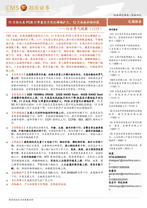 PCB订单 交通运输 存储器价格 面板价格 行业景气
