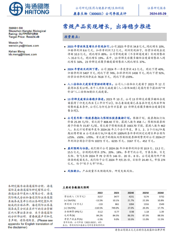 【海通国际】【20240529】康泰生物-300601.SZ-公司季报点评:常规产品实现增长,出海稳步推进-11页