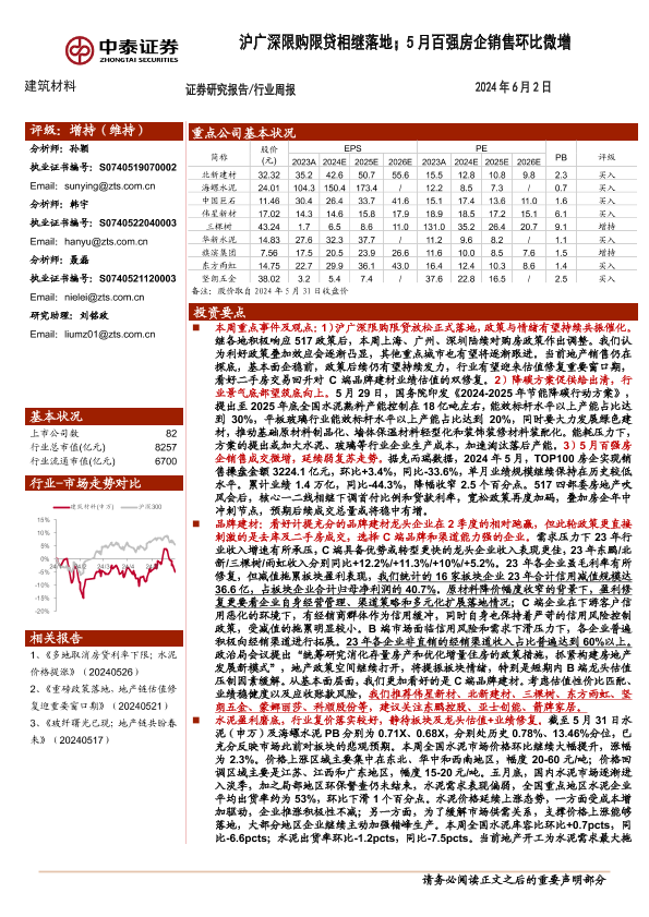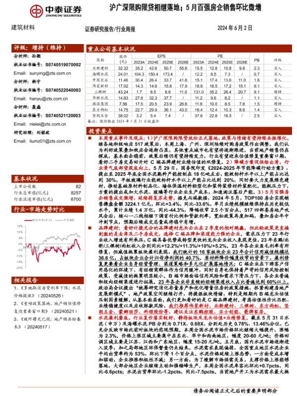【中泰证券】【20240602】建筑材料行业:沪广深限购限贷相继落地;5月百强房企销售环比微增-19页