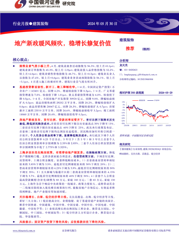 【银河证券】【20240530】建筑装饰行业月报:地产新政暖风频吹,稳增长修复价值-18页