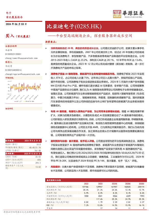 【华源证券】【20240603】比亚迪电子(0285.HK)平台型高端制造企业,探索服务器新成长空间-31页