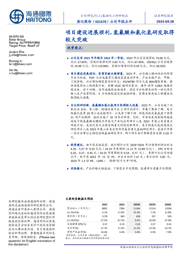 【海通国际】【20240529】滨化股份-601678.SH-公司年报点评:项目建设进展顺利,氢氟酸和氯化氢研发取得较大突破-11页