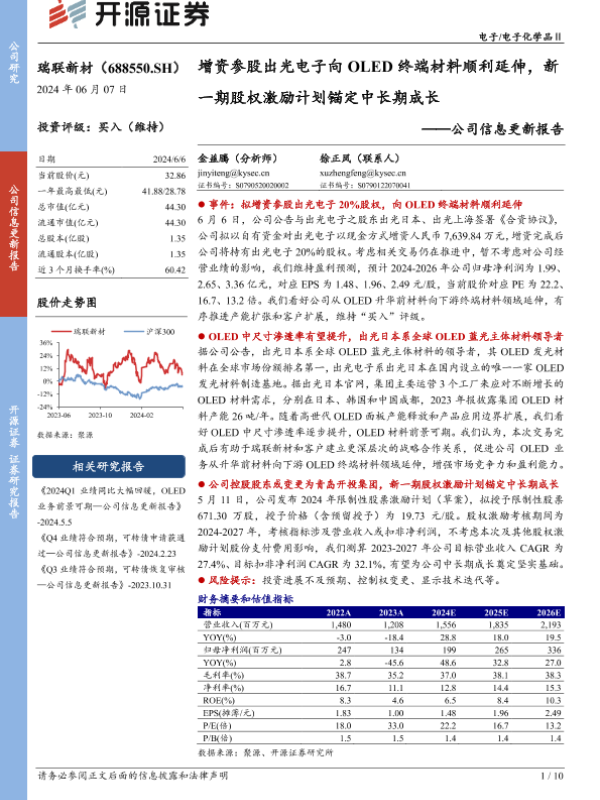 【开源证券】【20240607】瑞联新材(688550)公司信息更新报告:增资参股出光电子向OLED终端材料顺利延伸,新一期股权激励计划锚定中长期成长-10页