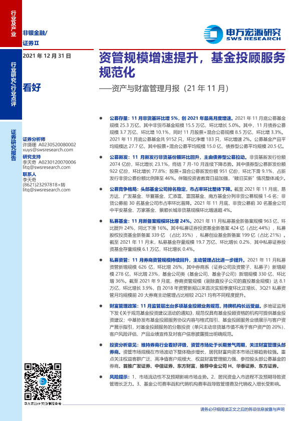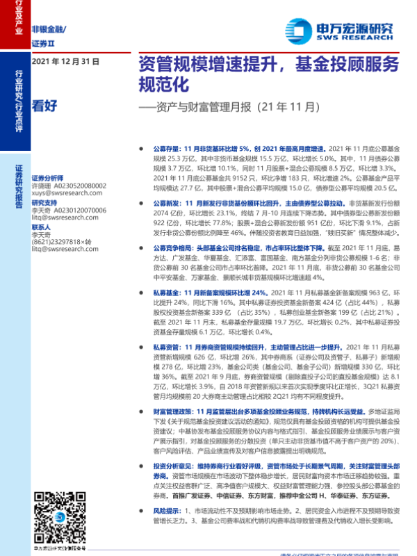 【申万宏源】【20211231】证券行业资产与财富管理月报(21年11月):资管规模增速提升,基金投顾服务规范化-20页