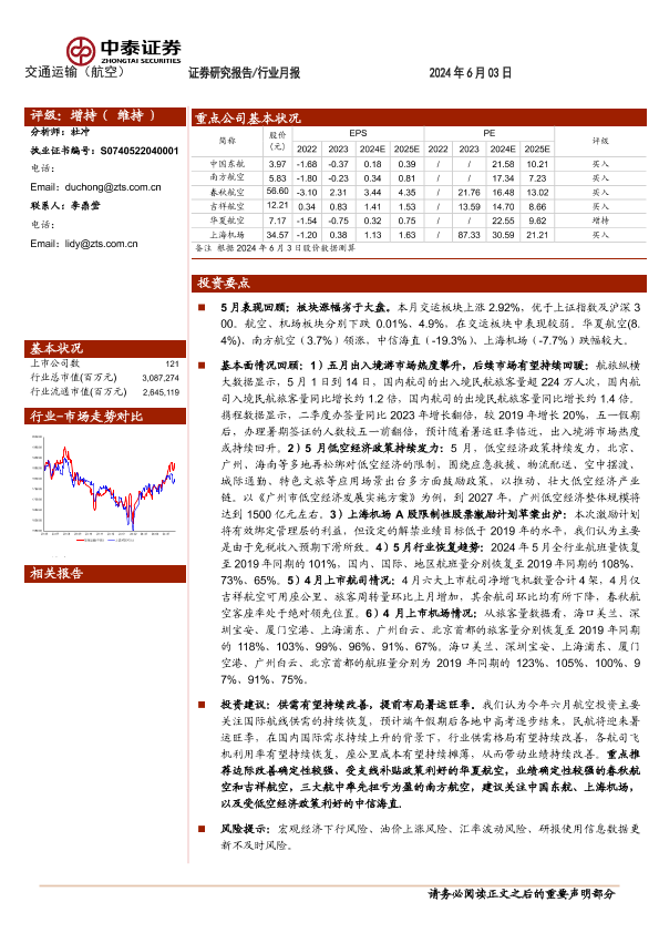 【中泰证券】【20240603】航空机场行业6月投资策略:供需有望持续改善,提前布局暑运旺季-15页