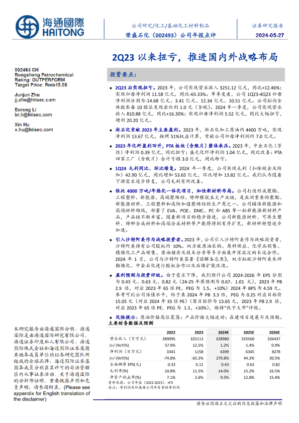 【海通国际】【20240505】荣盛石化-002493.SZ-公司年报点评:2Q23以来扭亏,推进国内外战略布局-14页