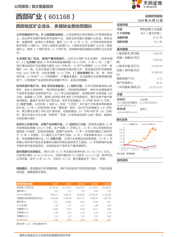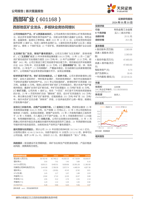 【天风证券】【20240530】西部矿业-601168.SH-西部地区矿企龙头,多板块业务协同增长-26页