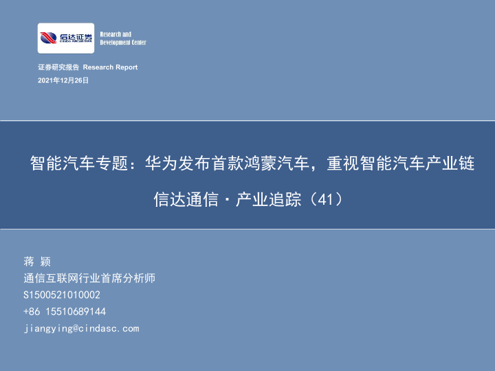 【信达证券】【20211226】通信行业·产业追踪(41):智能汽车专题,华为发布首款鸿蒙汽车,重视智能汽车产业链-43页
