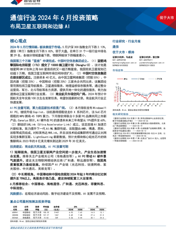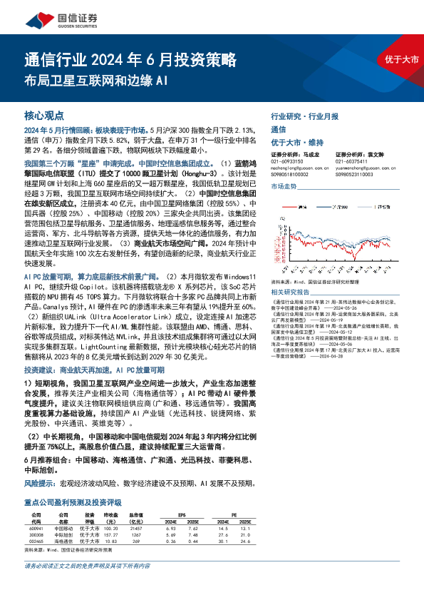 【国信证券】【20240603】通信行业2024年6月投资策略:布局卫星互联网和边缘AI-28页