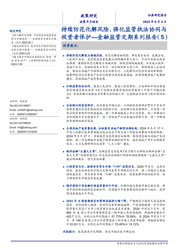 【海通证券】【20240604】持续防范化解风险,强化监管执法协同与投资者保护---金融监管定期系列报告(5)-19页