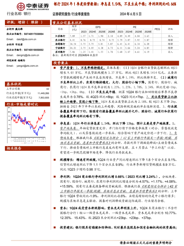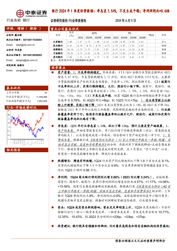 【中泰证券】【20240605】银行业2024年1季度经营数据:净息差1.54%,不良生成平稳;净利润同比+0.66%-12页
